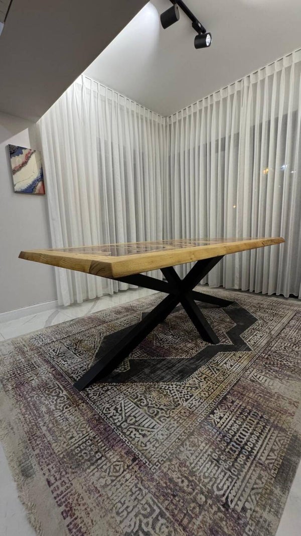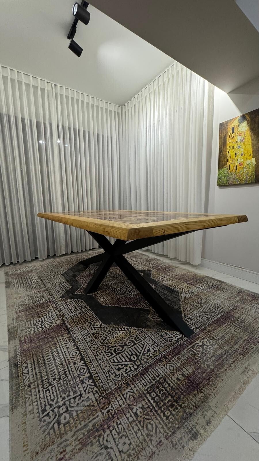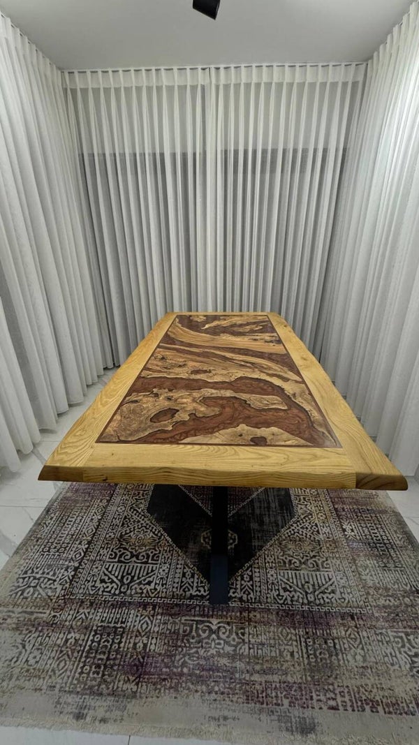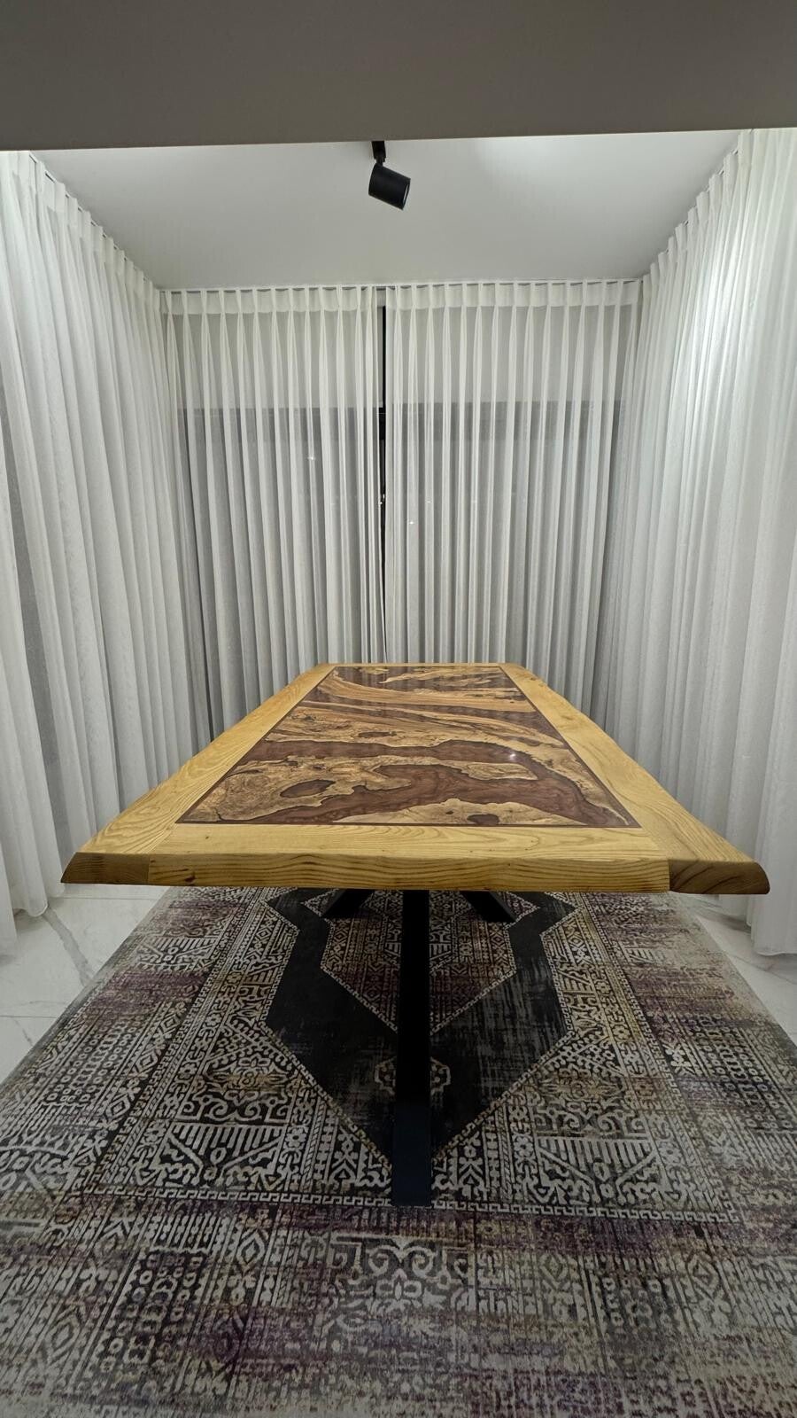 Olive Wood Table with brown metallic epoxy in 3d optics. Metal spider table legs