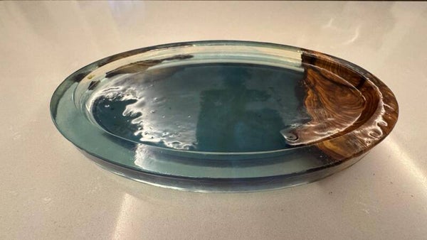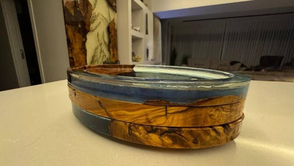 One set consists of 4 pieces of olive or pine wood with crystal clear or colored epoxy.